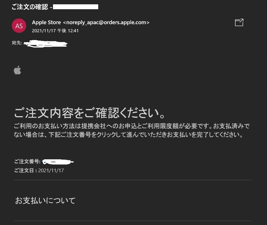 いわゆる「ご注文の確認」メールです。アップルからもそのタイトルできます。